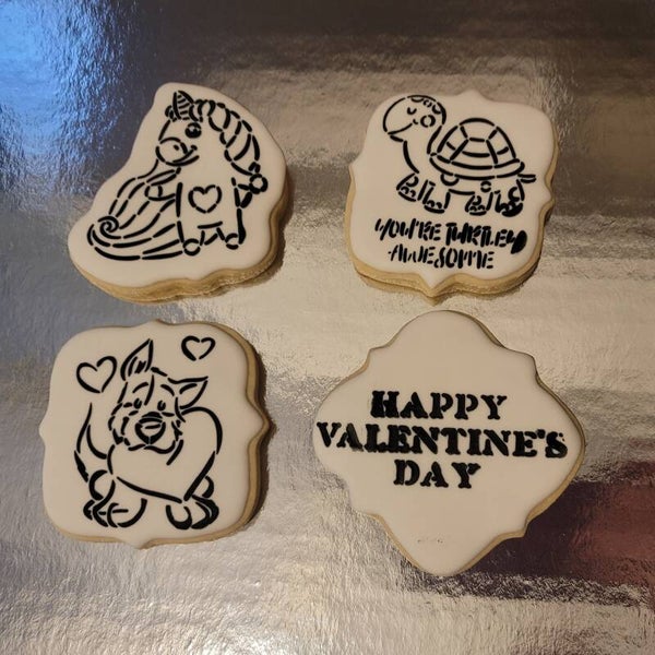 Paint you own cookies. White icing base with black outline of image. Comes with 1 paint pallette per 2 cookies and 1 small paint brush